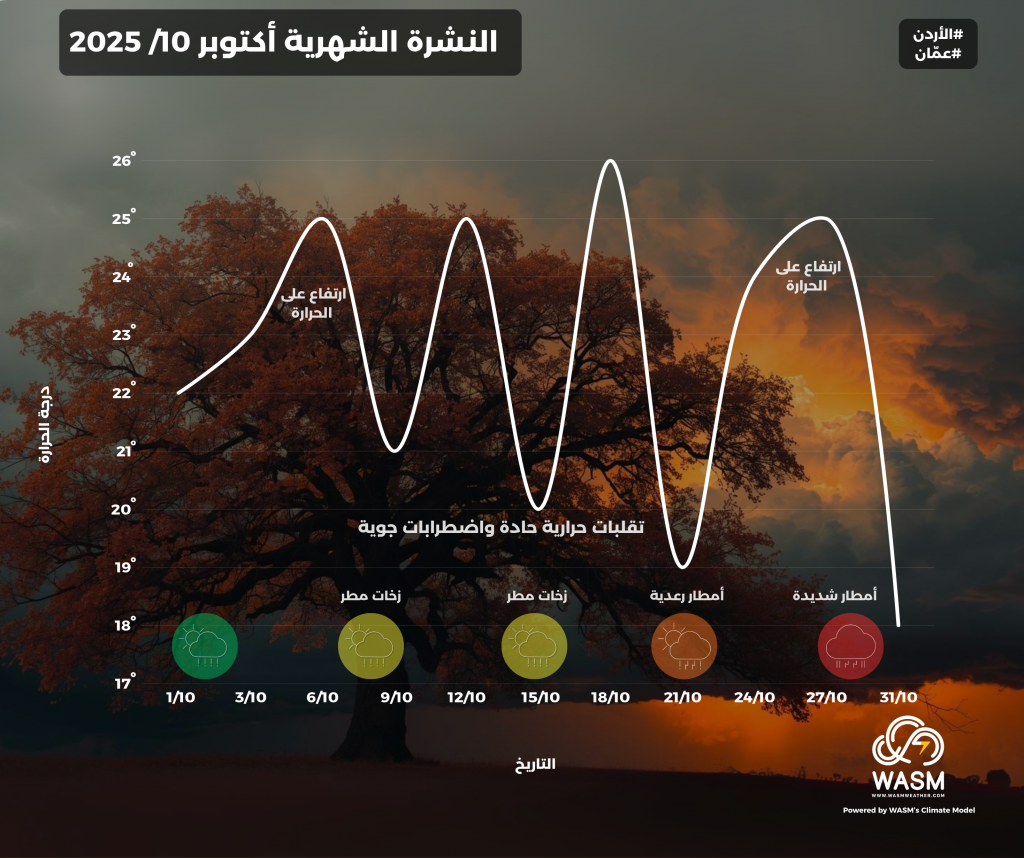وسم- يصدر مركز وسم الإقليمي النشرة الشهرية لشهر 10- أكتوبر – تشرين الأول من عام 2025 عبر بيانات النموذج المناخي الخاص بالمركز والمشغلة بتاريخ 25-09-2025، ويعتبر هذا النموذج الوحيد من نوعه في المنطقة العربية وحقق نتائج فائقة الدقة خلال شهر 9- سبتمبر من عام 2025 وانفرد بالتنبؤ بالحالة الممطرة الأخيرة.
