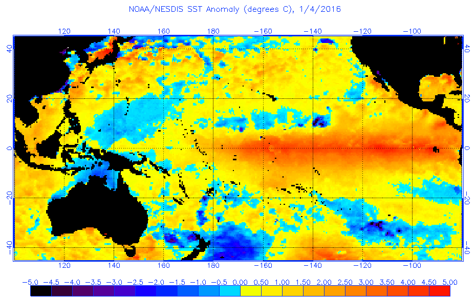 حرارة المحيط الهادئ عن المعدل العام اثناء حالة النينو التاريخية والقوية في 2016
