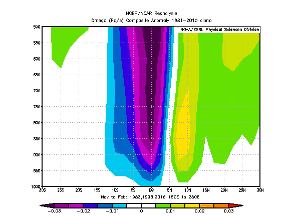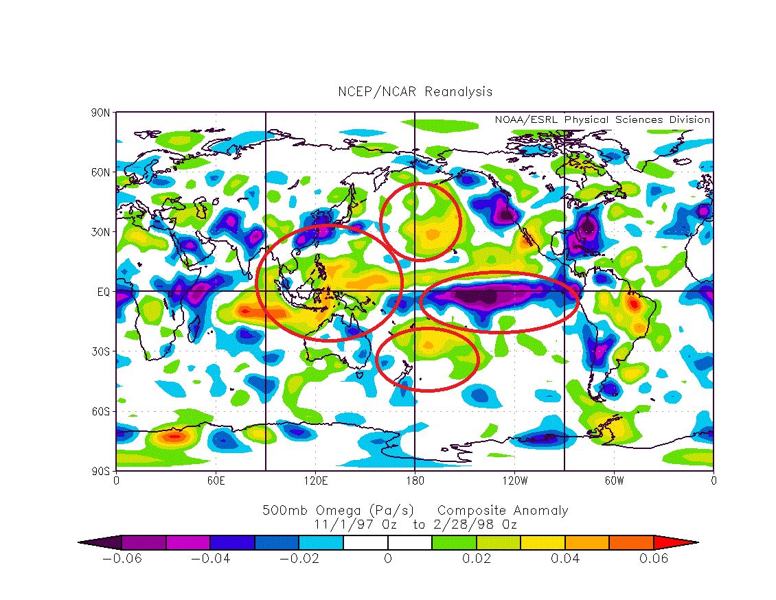 بالرغم من وجود اختلافات في تفاصيل الفعالية الجوية ، إلا ان النقاط الجوهرية وخاصة استراليا والمحيط الهادئ واضحة في 1998، الفرق هو وضوح خلية المحيط الهندي بشكل أكبر التي تتأثر بخلية واكر، +0.02 PA/S خلال فترة نوفمبر-دميسمبر-يناير-فبراير فوق المحيط الهادئ وقيم تصل الى 0.06+